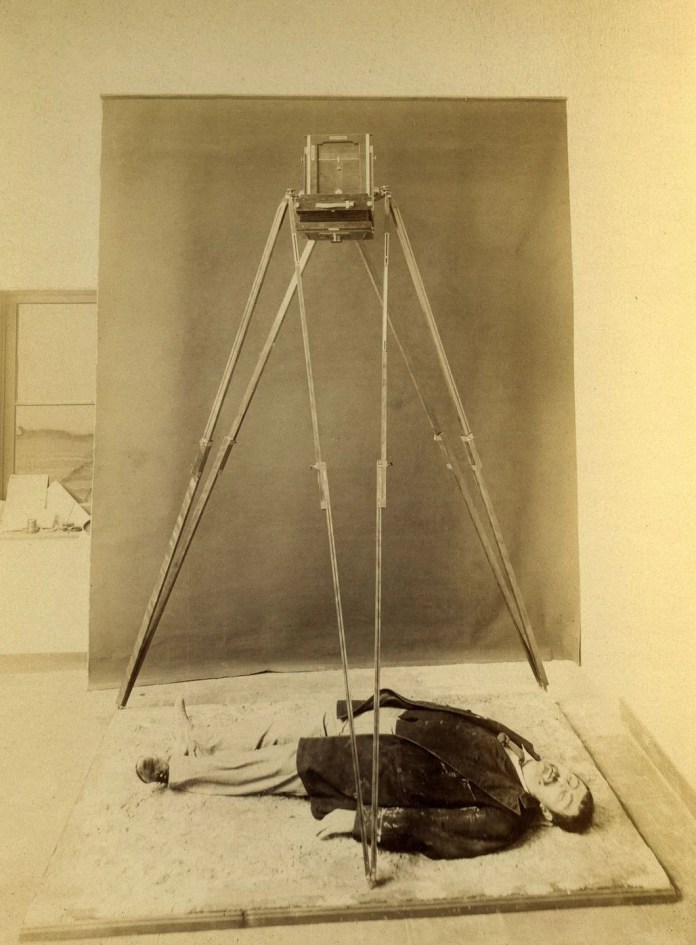 Bertillon, cinayet sahnelerini adli doğrulukla ve diğer araştırmacı inovasyonlarla fotoğraflamak için özel bir yukarıdan aşağıya tripod (Fotoğraf makinesinin veyahut kameranın bir dengeye alarak sabitlemeye sağlayan 3 ayaktan oluşan alet) tasarladı.