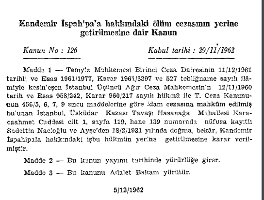 İdam dosyası önce TBMM’den, sonra Cumhuriyet Senatosu’dan geçer ve Cumhurbaşkanı Cemal Gürsel’in onayına sunulur. Sipahipala’nın avukatı, Cumhurbaşkanına uzun bir telgraf çekerek müvekkili için af istese de Gürsel’den de onay alan idam, 7 Aralık 1962 tarihli Resmi Gazete’de yayınlanarak yürürlüğe girer.