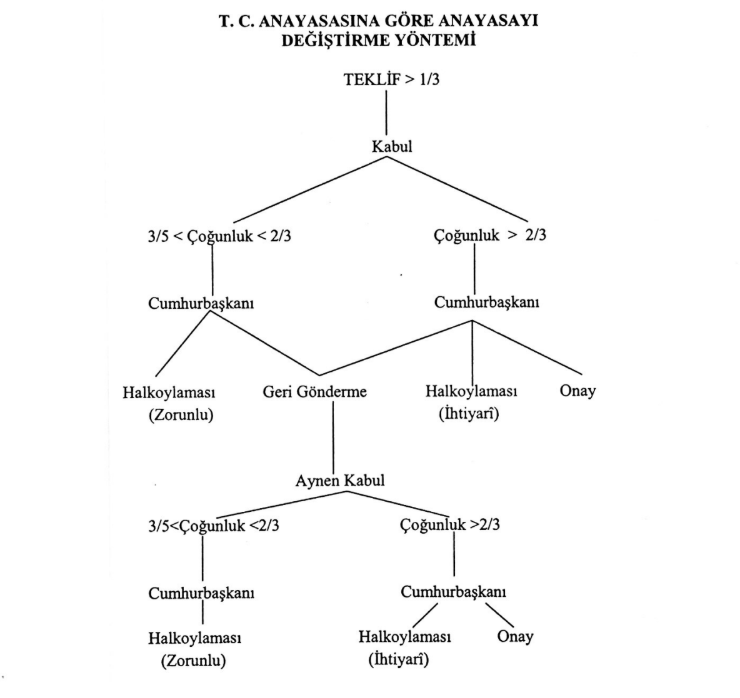 Anayasanın 175. maddesinin birinci fıkrasında, teklif, görüşme ve oylamaya ilişkin genel kural konulmakta, değişiklik tekliflerinin iki defa görüşüleceği belirtilerek, değişiklik teklifinin kabulü için de Türkiye Büyük Millet Meclisi üyelerinin beşte üç çoğunluğunun oyunun aranacağı öngörülmektedir. (…)