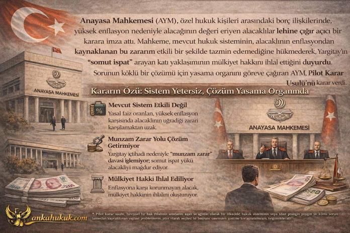 Anayasa Mahkemesi (AYM), özel hukuk kişileri arasındaki borç ilişkilerinde, yüksek enflasyon nedeniyle alacağının değeri eriyen alacaklılar lehine çığır açıcı bir karara imza attı. Mahkeme, mevcut hukuk sisteminin, alacaklının enflasyondan kaynaklanan bu zararını etkili bir şekilde tazmin edemediğine hükmederek, Yargıtay’ın “somut ispat” arayan katı yaklaşımının mülkiyet hakkını ihlal ettiğini duyurdu. Sorunun köklü bir çözümü için yasama organını göreve çağıran AYM, Pilot Karar Usulü’nü * uygulamaya karar verdi.
