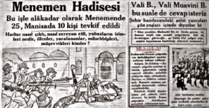 Menemen 3 (AA.) (Sabaha karşı) – İdama mahkûm olanların haklarındaki hüküm bugün sabaha karşı saat iki buçukta merasimi kanuniye badelifa infaz edilmiştir. Bu 28 mahkûmdan Mehdi’nin arkadaşı Mehmet Emin, Menemen’li Jozef, Manisa’lı Hacıpaşa zade Ragıp, Manisa’lı Şeyh Hafız Ahmet, Alâşehir’li Şeyh Ahmet Muhtar, Manisa’lı tatlıcı Hüseyin, Şeyh Esad’ın oğlu Mehmet Ali hükûmet meydanında, Menemen’li Ramiz, Menemen’li Yahya oğlu Hüseyin, Menemen’li manifaturacı Osman, Manisa’lı İbrahim oğlu İsmail, Lâz İbrahim hoca da istasyonda, Bozalan’lı İbrahim oğlu Koca Mustafa, Bozalan’lı Hacı İsmail oğlu Hüseyin, ŞimbiIli Mehmet, Menemen’li Kerim oğlu İbrahim, Tabur İmamı Hoca İlyas. Manisa’lı topçu Hüseyin, Manisa’lı Süleyman çavuş, Bozalan’dan Hasan oğlu Hacı İsmail, Menemen’li Çıtaklı Molla Süleyman, Menemen’den Boşnak Abbas, Manisa’dan Süleyman, Manisa’dan Hafız Cemal, Manisa’dan kahveci Mustafa, Manisa’dan eskici Hüseyin, oğlu Hüseyin Ali’den ibaret yedişer kişilik iki grup ta Tuz pazarında ve bedesten ve sinema önünde asılmışlardır. Bu 4 gruptan üçünün saat 9.5 ta, İstasyon grubunun da saat 12 de cesetleri kaldırılacaktır.