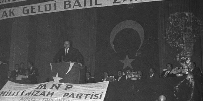 1- 8 Şubat 1970 tarihinde Ankara’da Büyük Sinemada yapılan toplantıda (C. 1. E. 1.) partinin açılışını kutladıklarını ifade ettikten sonra «biraz önce sizlere M. N. P. kurucuları takdim olundu. Ama sizden niçin saklayalım, niçin partimizin hakiki kurucularını bu ilk açılış gününde zikretmeyelim. Açıkça ilan ediyorum ki, bizim partimizin kurucuları Sultan Fatih Hazretleri, Sultan Yıldırım Hazretleri, Sultan Murat, Sultan Melikşah, Ulubatlı Hasan, Orhan Gazi, Nizamülmülk, Akşemseddin, Sultan Yavuz, Kılıçarslan, Alp Arslan, Gelenbevi Hazretleri ve Sultan Hamit’dir.» (S. 6) demiş ve partinin kuruluş beyannamesinden pasajlar okuyarak konuşmasını bitirmiştir.